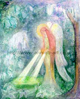 An angel shines her light over the sacred Chalice well at Glastonbury and is joined by a beautiful unicorn. Soft water colour style in purples, greens and white make this a truly magical image.
