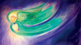 A beautiful turquoise angel flies through the magical purple heavens shining her light carrying a golden heart