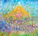 'Be open to the beauty of the earth' a magical painting inspired by the love and joy of nature. A goddess sits blissfully emerged in the nurturing beauty of mother earth, surrounded by flowers, love and holds a big pink heart.