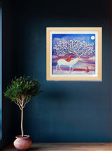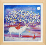 'The faery the fox and the magical white stag' a hand finished giclee medium sized mounted print in a natural wood framed print.