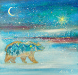 This magical painting by Cornish artist annie b. is now available as a print. Bear spirit walking across a magical landscape dreaming of all the land, stars , snow and trees. Bear teaches us to go within to dream. Bear also teaches us to connect to our inner strength, power & confidence ,to self heal, grounding and introspection