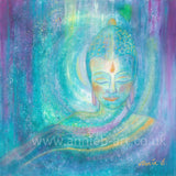 This serene painting by Cornish artist annie b. depicts a peaceful buddha sending out light, love and blessings of hope to the world.