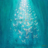 Caribbean blue III fine art giclee print. This magical image was created as part of a set of three paintings of the white butterflies flying over the turquoise Caribbean ocean inspired by a magical event that occurred on our wedding day, when just before the ceremony thousands and thousands of white butterflies were seen flying over the ocean and beach where our ceremony was taking place. A true blessing.