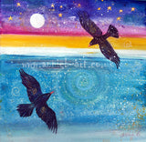 Two rare Cornish choughs with their red beaks flying over the turquoise ocean below a magical full moon and starry sky
