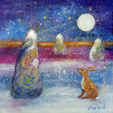 This magical painting by Cornish artist annie b. is now available as a print. A mystical hare sits within the ancient stone circle connecting to the land and the ancestors under a full moon starry sky.