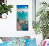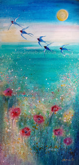 This brightly coloured painting is inspired by the epic journey those magical swallows make each year, flying home to Cornwall all the way from Africa.