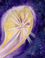 An angel with golden wings holds a beautiful quartz crystal and shines her love and light to you and the world.