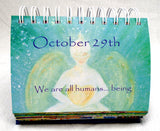 I was absolutely delighted to receive two of Annie’s beautifully packaged perpetual calendars, one for a friend of mine as a Xmas Present and one for myself. Upon opening the parcel I first of all noticed the high quality of the paper and print; the calendar stands up really well and the pages turn effectively. Most of all of course, I am enthralled with the wonder-full artwork and truly inspirational daily quotes. Every morning it’s a joy to turn the page for the current day and be instantly uplifted! Thank you so much Annie, you are a star. Such a lovely calendar and much love and angel blessings to you Elisabeth xxx