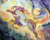 Two people ride on the back of the magical unicorn as he flies into the heavens amongst the stars and moons into an ethereal world where anything is possible and dreams do come true.
