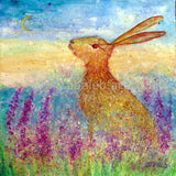 A magical brown hare sits in a meadow of wild flowers under a new moon.