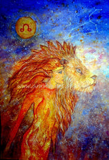 This beautiful painting incorporates the characteristics of Leo the fire sign.... and is painted in mixed media on heavy watercolour paper.  The goddess merges with the lion energy and fire sign above.