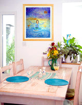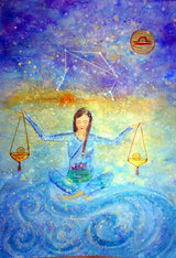 This horoscope painting incorporates the characteristics of Libra the Air sign and is painted in mixed media on heavy watercolour paper with a touch of gold and sparkle which has reproduced beautifully as a print.  A Libra is a person born between September 23rd and October 22nd.  Libras are known for being charming, beautiful, and well-balanced.