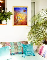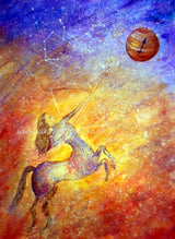 This beautiful painting incorporates the characteristics of Sagittarius the fire sign... and is painted in mixed media on heavy watercolour paper in acrylic with a touch of gold and sparkle. Sagittarius, the half human and half horse, is the centaur of mythology, the learned healer whose higher intelligence forms a bridge between Earth and Heaven. Sagittarian are often optimistic, love freedom, are funny, fair -minded, honest and intellectual.