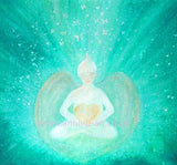 A white buddha angel sits holding a heart sending out light and love to the world surrounded by white butterflies on a turquoise background. Buddha art. Meditation art.
