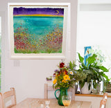 A large mixed medium painting on hand made paper, mounted and framed with a white washed wooden frame ready for your walls to uplift any space.