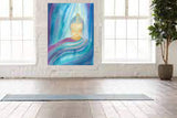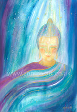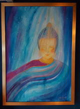 This large serene painting by Cornish artist annie b. depicts a blissful buddha figure surrounded by light and butterflies.  A large painting to remind us, Buddha is always bigger than our worries.