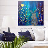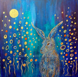Hare painted in gold on a deep turquoise teal background surrounded by abstract flowers and below a golden full moon.