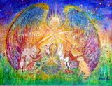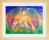 An inspirational painting for your children to help connect them and the whole family to the magic of the world and all who live on earth.. Created with mixed medium and a hint of sparkle on water colour paper. An angel shines her light on a meditating child surrounded by hare, fox, squirrel, goat, deer, badger, hedgehog family, mouse, dog, cat and humming bird.