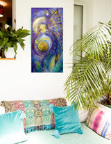 Original painting in mixed media on deep box canvas in blues, purples and turquoises with a hint of sparkle and gold ready for your walls to lift and enhance any home, workspace or meditation centre.