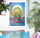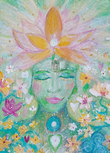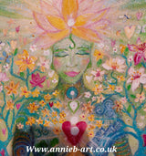 This large painting by Cornish artist annie b. depicts the magic and wonder of  Goddess Gaia - Mother earth in her true Divine beauty.  The painting celebrates the love she shines, her bountiful abundance and deep nurturing energy.   To raise the vibrational energy further  the painting has a Herkimer Diamond Quartz crystal placed in her third eye.  Sit with this wonderful Goddess and feel her love shining out to you and the world