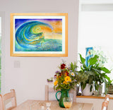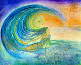 Inspired by the magnificent ocean and seas of Cornwall and the world Goddess Oceana rides the waves of the ocean accompanied by her friends the dolphins and fishes under a new moon. As the wave breaks white horses gallop to the shore. A Steiner inspired painting connecting all as one.