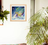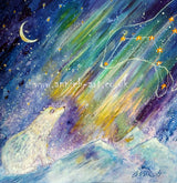 This mixed medium painting on watercolour paper mounted and framed in a natural wooden frame white washed, is full of magic and light as the ice bear connects with the Great star bear- Ursa Major, in the sky surrounded by the magical northern lights. The perfect painting to bring joy and magic to your home especially a child's bedroom