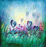 Fox gloves, poppies, and lots of wild flowers reach up to the sunshine in the azure blue sky above sending out their love as hearts float gently to the sky.. where love grows a painting depicting all the love of mother earth and reminding us to be mindful of the love in every moment.