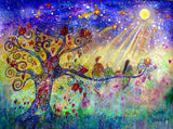 A family sit in the magical tree of life under the magic of the full moon and shooting stars.... An inspirational painting for your children to help connect thema and the whole family to the magic of the world and the moment.