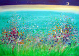 Wild flowers dance with love and joy over the turquoise Cornish ocean under the curved horizon and a inky sky with a new moon. Hearts and butterflies fly above the flowers and poppies.