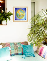 'Moon Spirit' original painting in mixed media on watercolour paper with a hint of sparkle- framed in natural wooden frame.