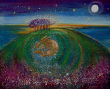 An original mixed medium painting of the magical trees you can see on the road home to Cornwall with a bit of extra magic and sparkle. Hare sleeps deep within the hill of flowers under a new moon and starry sky.