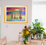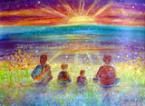 A family sit together enjoying each moment as they watch the golden sun disappear into the turquoise ocean. An inspirational painting for your children to help connect them and the whole family to the magic of the world and the moment. Meditation mindful art