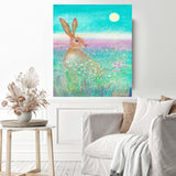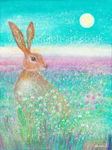 A magical hare sits amongst the spring abundant flowers under a turquoise sky and full moon embracing spring