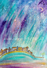 This magical painting by Cornish artist annie b. captures the wonderful light and starry sky magic of the St. Ives harbour, Cornwall