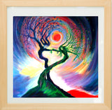 Two tree spirits dance beneath a rainbow sky, twirling, flying free. My most successful image which has appeared on books, music cd covers and celebrated worldwide. I wrote this poem to go with the painting.