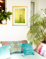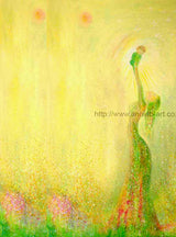A fine art giclee print in greens and yellow and pink flowers evolves into a mother rejoicing with love as she connects with her beautiful new baby.- a celebration of new life. A connection with the beauty of the earth and all her abundance. The perfect print for a babies nursery, a bedroom or family home.