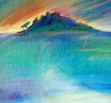 This painting was inspired by the mystical St. Michaels mount in west Cornwall, a place where many leylines meet, and of wonderful energy.  Archangel Michael's presence is often felt here amongst the tropical gardens and old chapel.  The walkway is covered by the sea on high tide and often a figure is seen walking it's path.