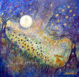 This painting is of a hare sitting beneath a magical tree full of love and stars, enchanted by the beautiful full moon. Purples, yellows, gold and a hint of sparkle by Cornish visionary artist annie b.