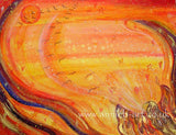 Shaman connecting with air spirits, bird spirit and sun spirit as she opens her arms to the joy of the world on this magnificent sunset painting.
