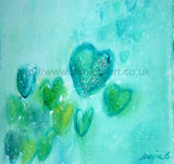 Gentle green blue and turquoise hearts in a water colour style float effortlessly to the sky shining out their love. Such a calming painting full of joy for wellbeing. Part of the love series.