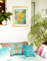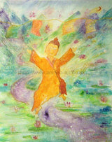 Buddha leaps with joy under the prayer flags, reminding us - there is no way to happiness, happiness is the way. A water colour style painting of bright colours to fill our home, office or yoga studio with joy.