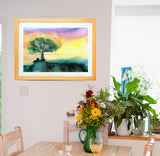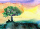 A water colour painting of a gentle happy tree with a purple orange yellow sky. I paint intuitively and allow the paint to flow and the image to form the magic on the canvas.
