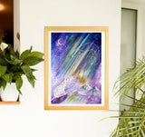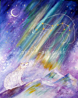 This painting is full of magic and light as the ice bear connects with the Great star bear Ursa major, in the sky surrounded by the magical northern lights. The perfect painting to bring joy and magic to your home especially a child's bedroom
