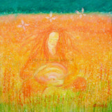 A mother to be sits in nature connecting to her baby within feeling blissful. Oranges, yellows and a turquoise sky above, with three white butterflies.