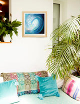 A turquoise blue wave builds and crashes over spilling out the white foam and hearts. Within the wave it says - 'let your love flow free like the ocean' as the ocean gives us so much love. The perfect print gift for surfers and lovers of the ocean and is inspired by the Cornish north coast wave breakers.