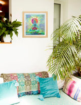 A painting inspired by the practice of meditation and the connectedness of all things.. from the heart. A buddha type figure sits in meditation sending loving kindness out to the world. Art for meditation studio, theraphy room, tranquil home, office or spa. Bright colours and a touch of sparkle and iridescent paint. Meditation art.