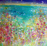 Magical joyful wild flowers and poppies dance above the beautiful turquoise ocean of the Cornish north coast full of love and joy beneath a new moon sky.