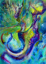 Two mermaids dance in unity deep within the magical turquoise ocean. A water colour style painting that flows and shines out in greens, aqua, blues and turquoise.