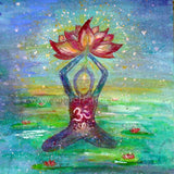 Meditation art. A buddha figure sits emerged in the beauty of a lily pond in meditation opening their heart to the love of the universe, reaching out with a pink lotus flower. The Aum symbol represents all of creation and that we are all connected all one.