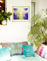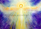 This golden angel, Solar angel shines out her radiant light, angel wings open on a purple galaxy sky, sending love and healing down to planet earth. Call on Solar angel if you need a lift of energy and healing from the higher realms.